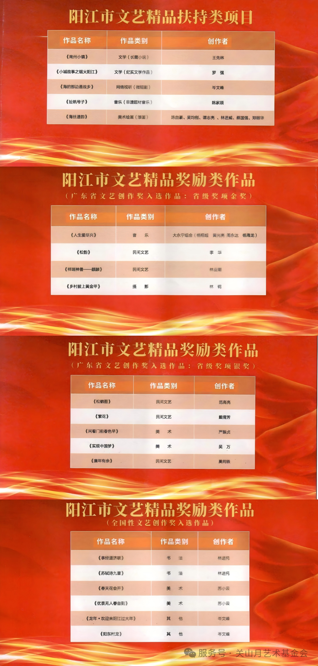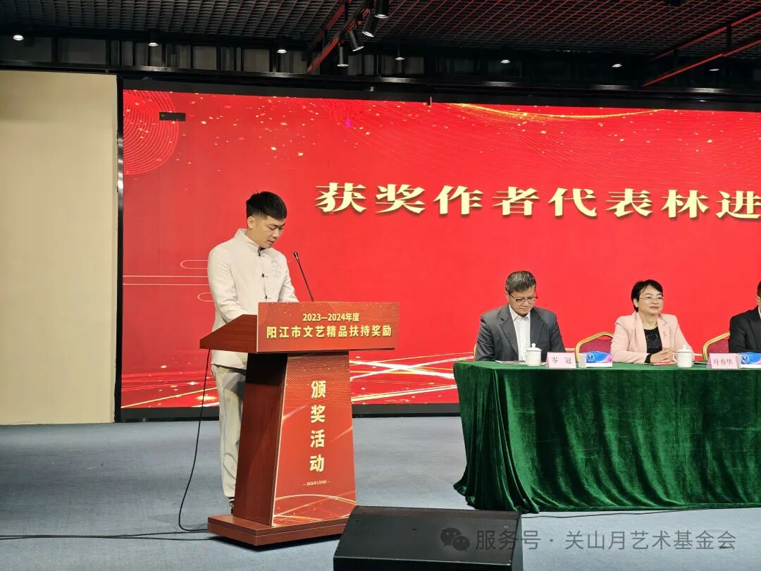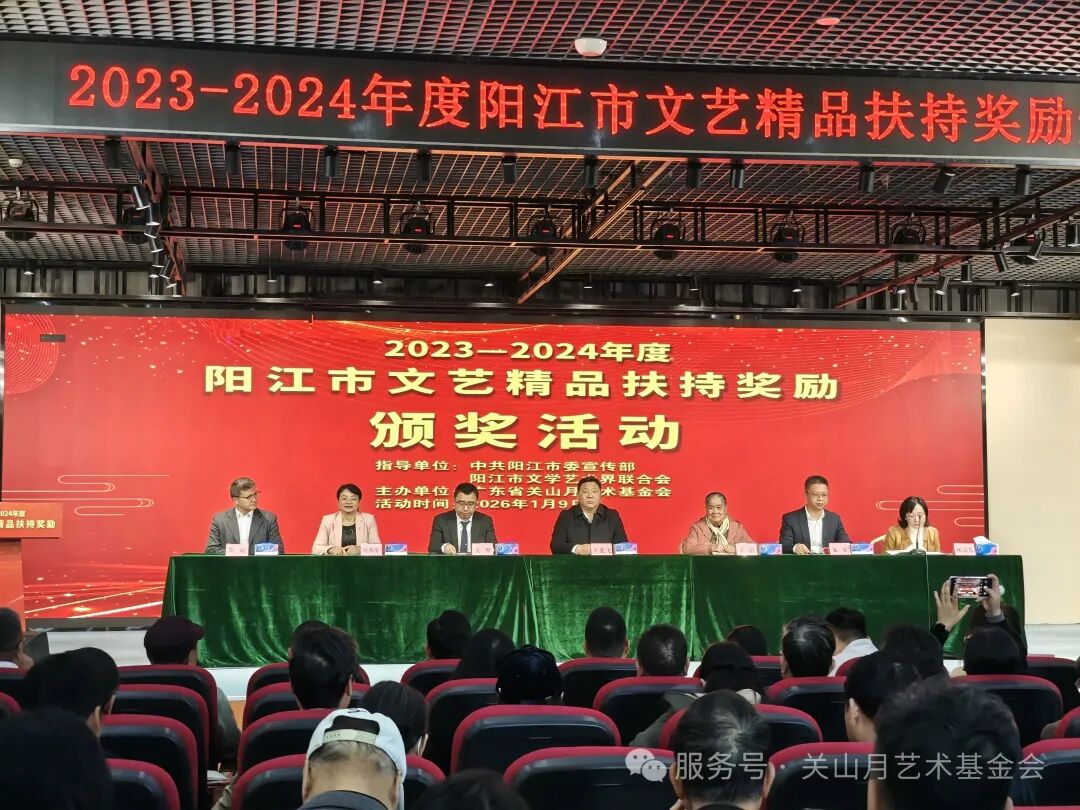 1月9日上午,由中共阳江市委宣传部、阳江市文学艺术界联合会指导,本会主办的“2023-2024年度阳江市文艺精品扶持奖励颁奖活动”在阳江市文化馆小剧场举办。阳江市委常委、统战部部长王光飞,广东省国际文化交流中心顾问、本会名誉理事长关怡,本会理事长关坚,阳江市文联党组书记、主席叶秀华等领导,以及文艺界嘉宾、获奖代表出席活动。